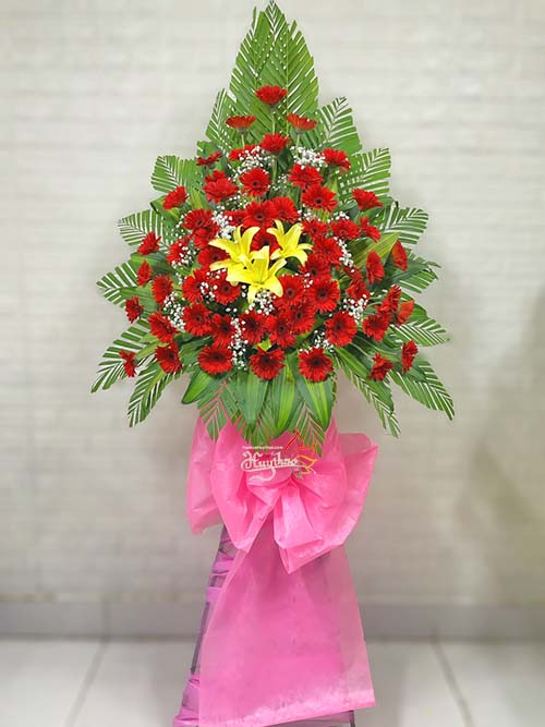 Kệ hoa 2 tầng với sự kết hợp của nhiều loại hoa như hoa cát tường, hoa lily, hoa hướng dương, tượng trưng cho sự phát triển và thịnh vượng. Đây là lựa chọn phổ biến cho các buổi lễ khai trương cửa hàng, doanh nghiệp lớn, thể hiện lời chúc mừng tốt đẹp nhất.